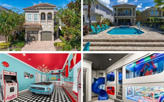 Located in the privately gated Bear’s Den neighborhood of Reunion Resort, this 8-bedroom, 8-full-bathroom, 2-half-bath home offers 5,625 heated sq ft and was built in 2018. The property has 12-foot ceilings on the first floor, a 2-car garage, and is offered fully furnished and turnkey. The home has never been rented and has only been used as a second residence. The kitchen features a double island layout, modern high-gloss cabinetry with lighted glass-front uppers, white quartz countertops, a JennAir gas cooktop with Zephyr range hood, two 36” JennAir built-in bottom-freezer refrigerators, a JennAir wall oven and microwave, and three JennAir dishwashers.The open living area connects to the outdoor space through corner sliding doors that lead to a covered patio with fireplace, a covered dining area with a built-in gas grill, vent hood, and sink, and motorized screens enclosing the entire space. The heated pool and spa include a sun shelf, an in-pool table with seating, and a pergola with a waterfall feature. An additional seating area with gas fire pit sits at the back of the pool, and a pool bath is accessible from the patio. The backyard has a private gate that leads directly into Golden Bear Park, available only to Bear’s Den residents. The park includes a putting green, great lawn, volleyball area, playground, and dog park.